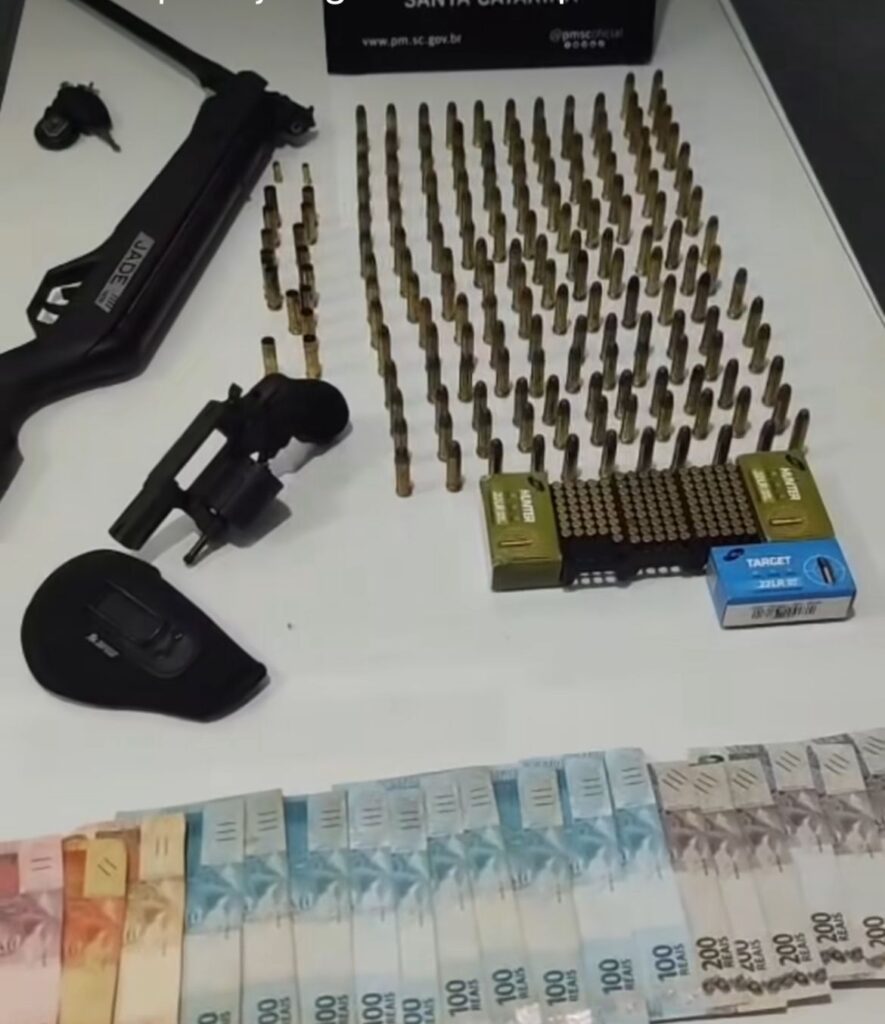 Durante buscas, um dos carros foi localizado em frente a uma casa noturna. O suspeito, de 30 anos, foi abordado e, com ele, encontrada uma munição intacta no bolso e uma grande quantia em dinheiro. Dentro do veículo, os policiais apreenderam um revólver calibre .357 com duas munições, além de outras 153 intactas e cápsulas deflagradas.