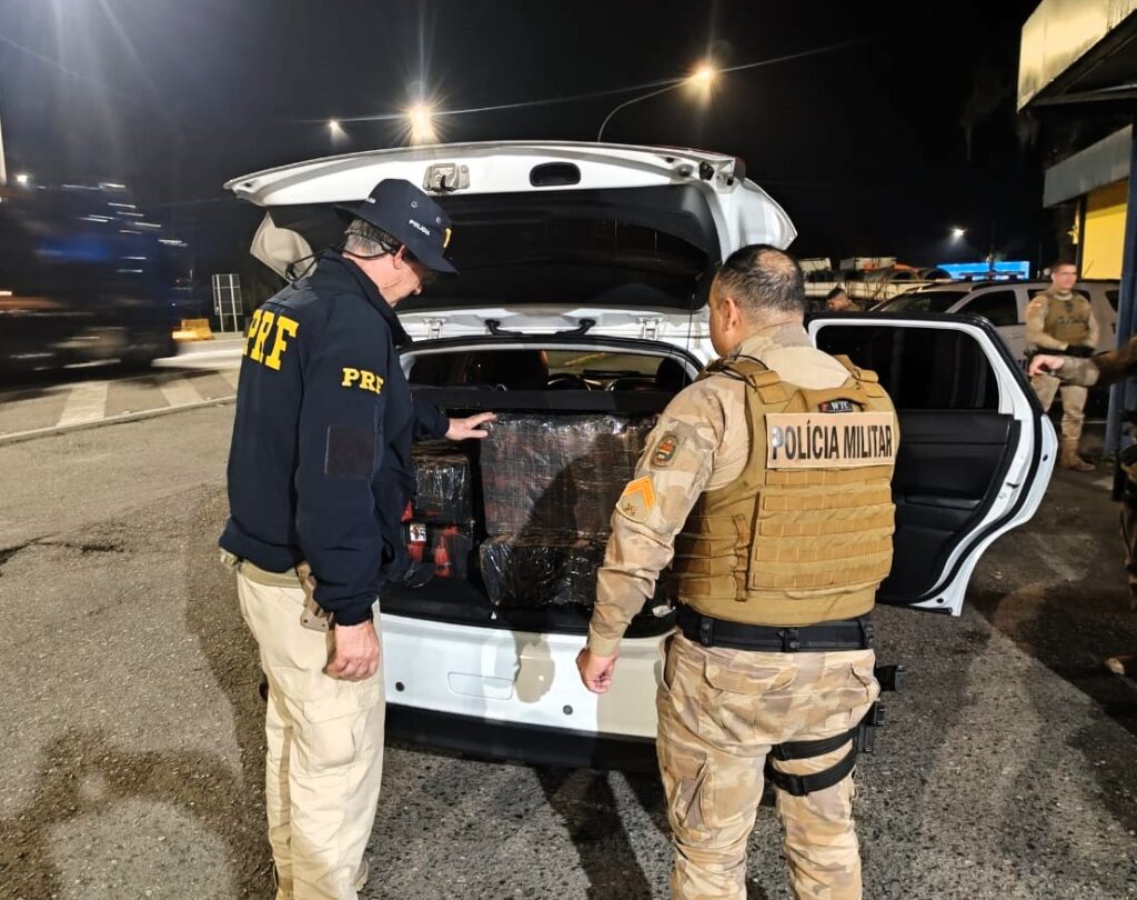 A abordagem aconteceu no km 11 da BR-101, sentido sul, após troca de informações entre as forças de segurança. Durante a vistoria, os policiais encontraram diversos fardos com tabletes de maconha no porta-malas do automóvel.